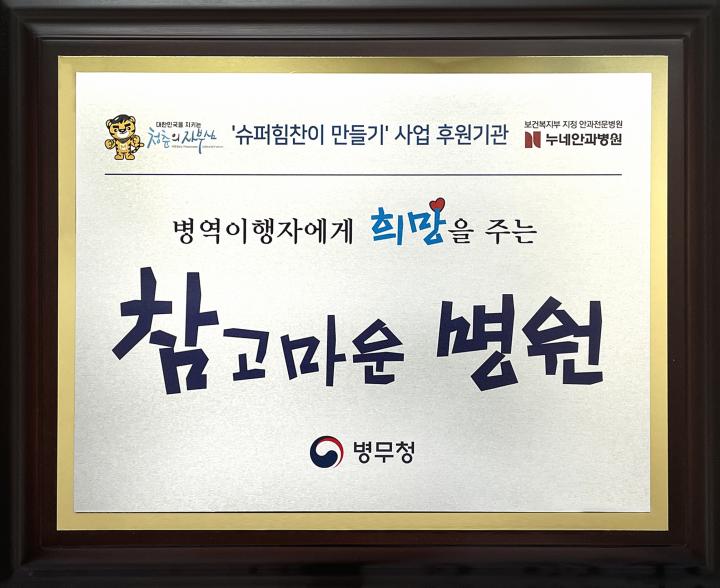 안녕하세요 대한민국 안과주치의 누나안과병원입니다. 대구누내안과병원(원장 김시열)이 대구경북지방병무청(청장 이익규)으로부터 ‘슈퍼힘찬 프로젝트’ 후원에 감사하는 마음을 담은 ‘참 고마운 병원’ 인증 현판을 지난달 25일 수여받았다.