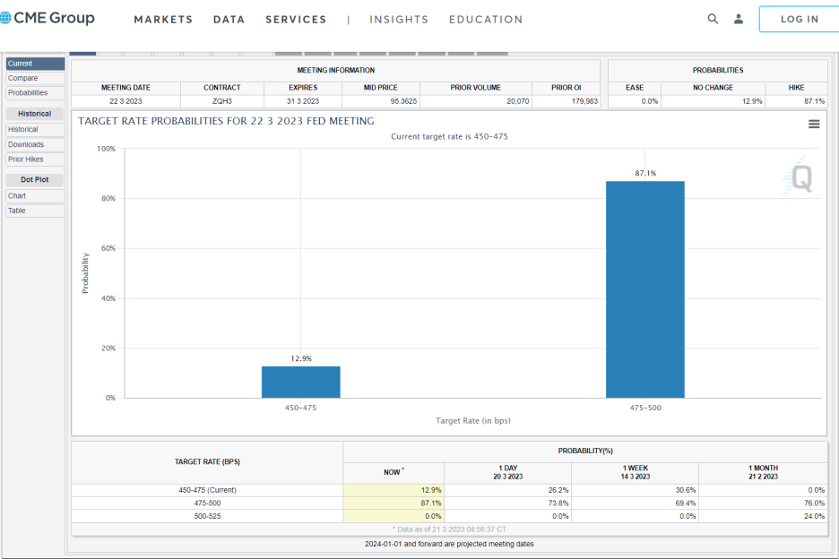 금주 최대 화두는 FOMC 기준금리 발표다. FED Watch에서 추정치는 25bp 상승의 87.1%(03/23/22 07:00 한국시간 기준)이다.