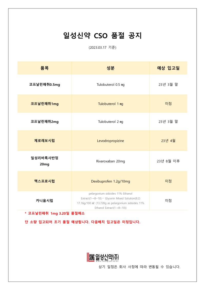 (일성신약) 품절공지
